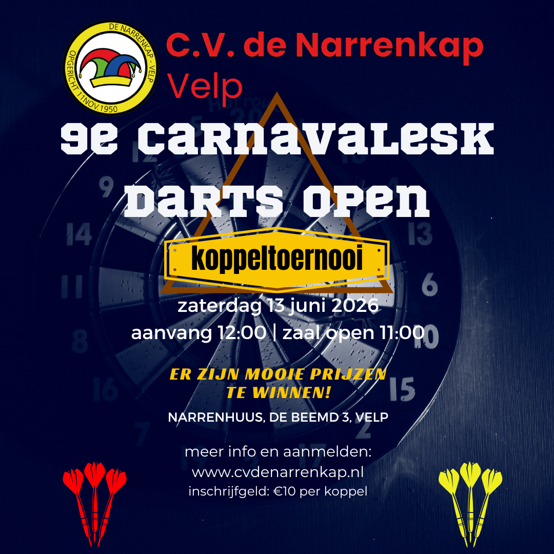 Narrenhuus De Beemd 3, Velp, NederlandOp zaterdag 13 juni organiseert de Velpse Carnavalsvereniging de Narrenkap wederom het jaarlijkse Carnavalesk Velps Open Darttoernooi in ’t Narrenhuus aan de Beemd in Velp. Vanaf 12:00 starten de eerste wedstrijden, de zaal is...